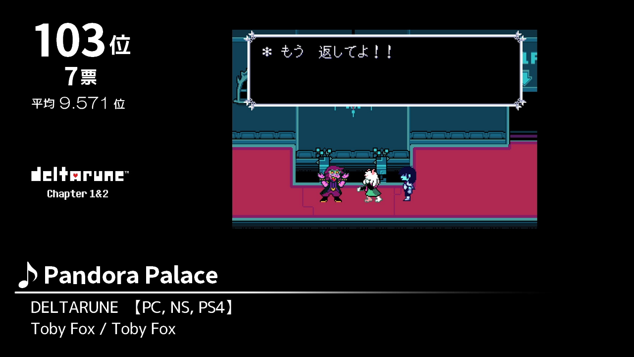どうやら俺は女性主人公の曲の方が好きなんだなと気づきました。去年開催の全部対象の投票の時もX女性主人公の曲に票を入れた記憶があるし